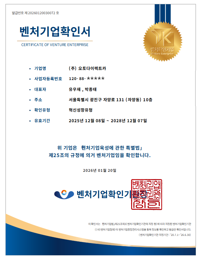 | 63 | [보도자료] 장기렌트·리스 전문 ‘오토다이렉트카’, 혁신성장유형 벤처기업 인증 획득 | 2026-01-20 | 조회수 : 1168 |